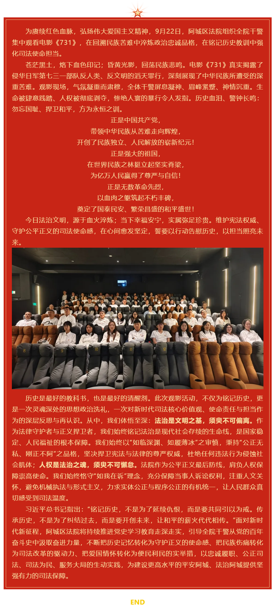 勿忘国耻 淬炼忠诚 笃行法治——阿城区法院组织干警集中观看电影《731》深悟政治忠诚与司法使命
