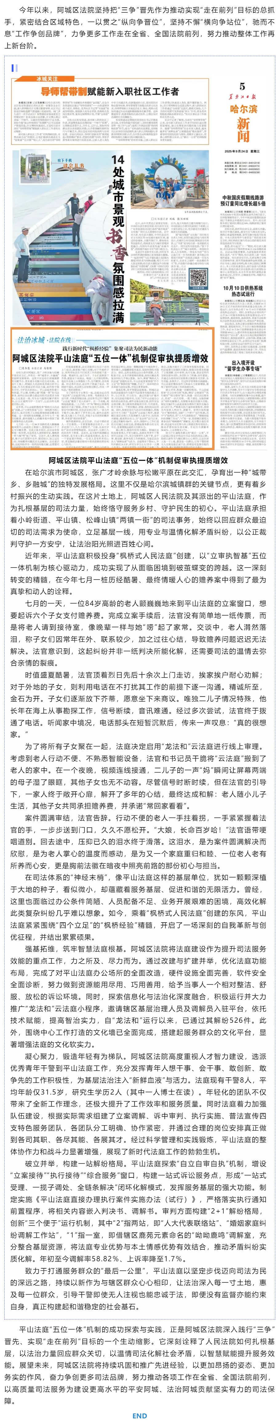 走在前列丨《黑龙江日报》刊发:阿城区法院平山法庭“五位一体”机制促审执提质增效