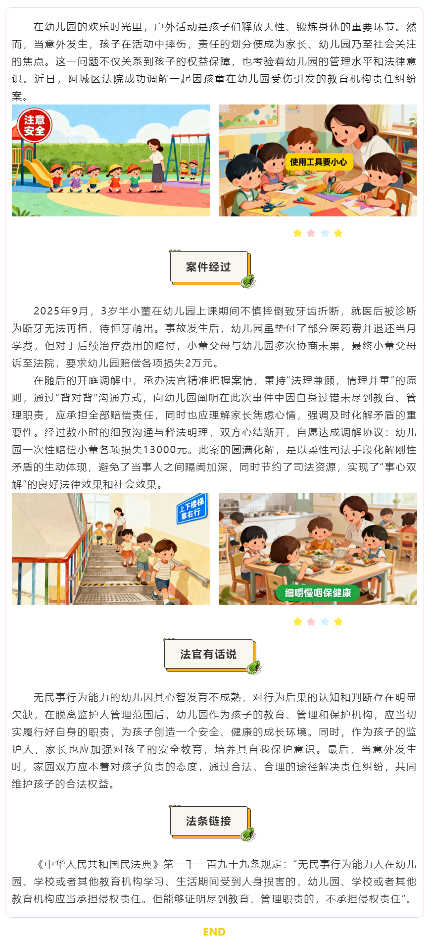 柔性司法暖民心,法理情融促和解——阿城区法院成功调解幼儿园儿童受伤纠纷案