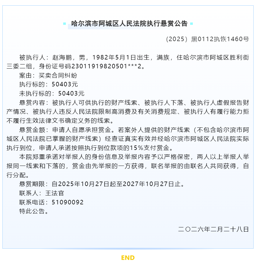 哈尔滨市阿城区人民法院执行悬赏公告