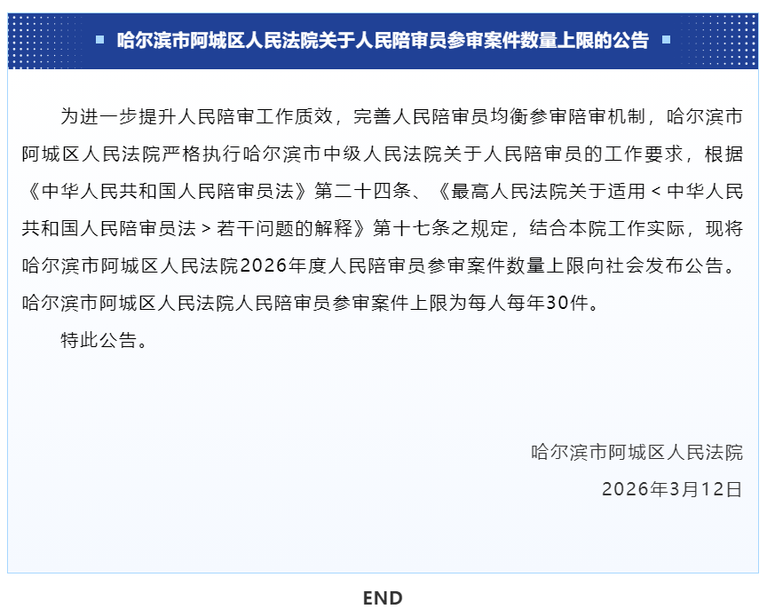 【公告】哈尔滨市阿城区人民法院关于人民陪审员参审案件数量上限的公告