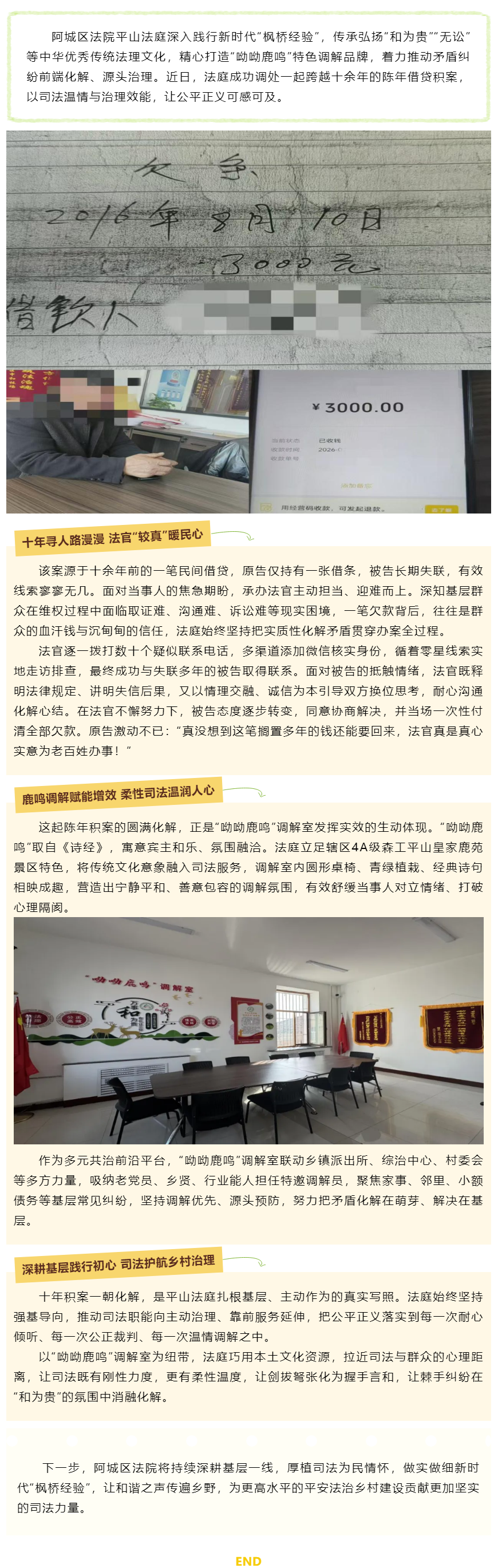 【法庭一线·多元解纷】十年旧账终化解 鹿鸣调解促和谐